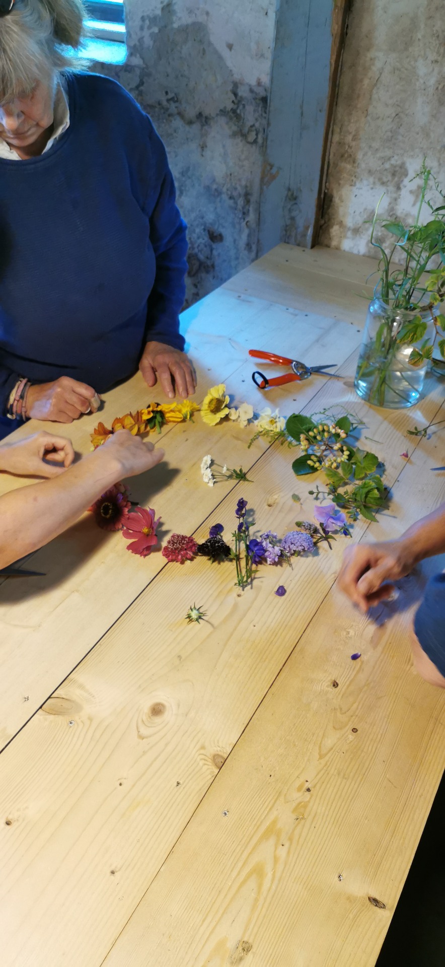 11 Augusti: Färg & form i högsäsong – Vi utforskar färgcirkeln och binder en spiralbukett med sensommarens överflöd. Vi pratar även om att skörda för att torka.